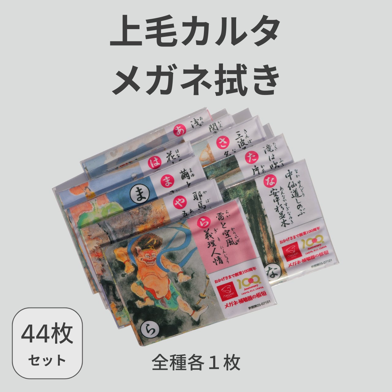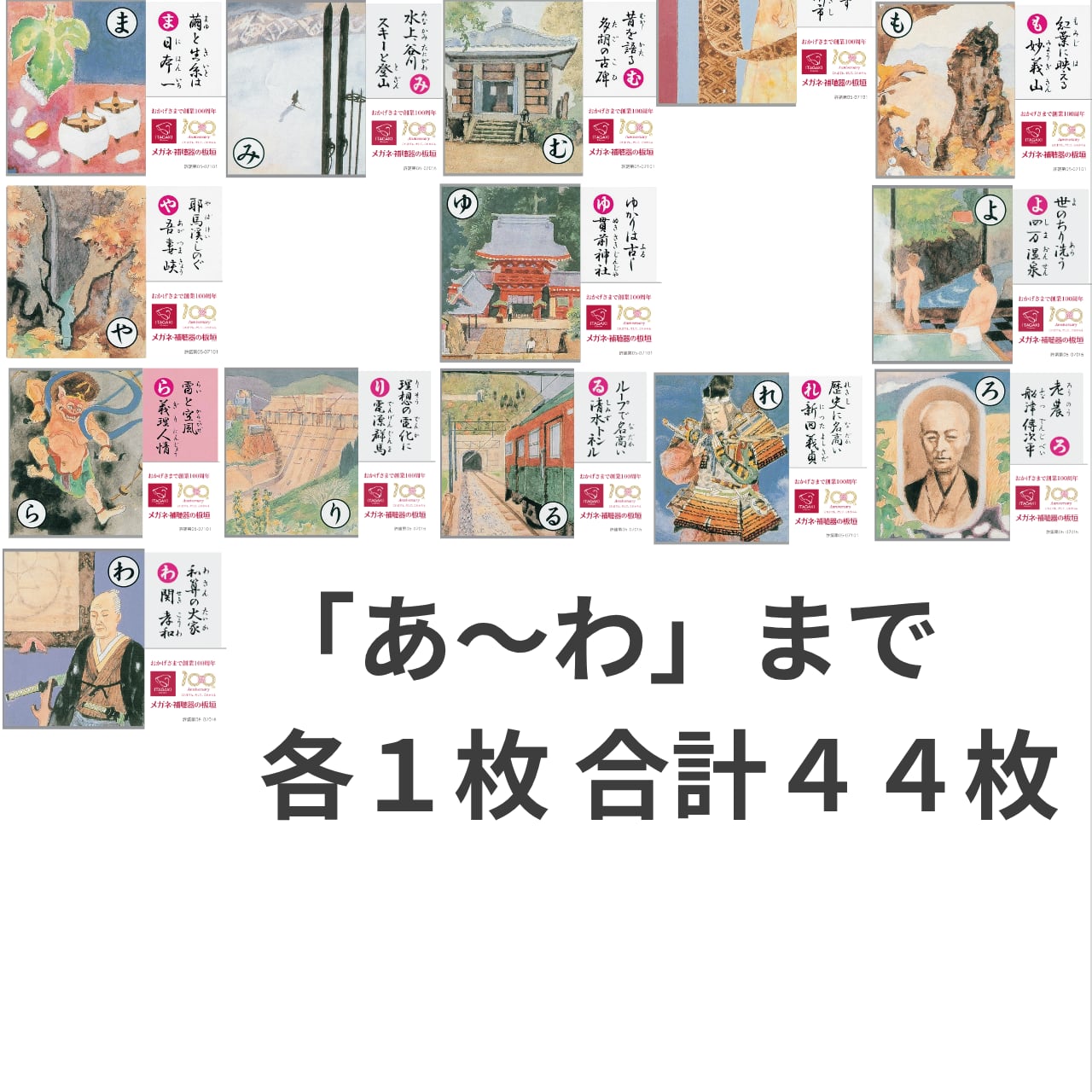1枚ずつ違う絵柄で、全44種類(あ〜わ)を完全収録。